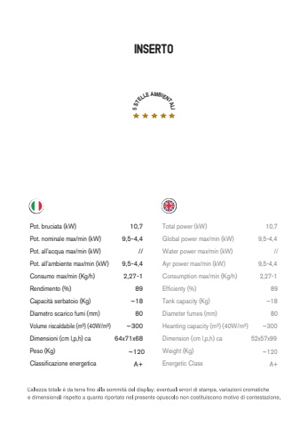 INSERTO5 STELLE AMBIENTALIPot. bruciata (kW) 10,79,5-4,4//9,5-4,42,27-189~18~300~1208064x71x68A+10,79,5-4,4//9,5-4,42,27-189~18~300~1208052x57x99A+Pot. nominale max/min (kW)Pot. all%u2019acqua max/min (kW)Pot. all%u2019ambiente max/min (kW)Consumo max/min (Kg/h)Rendimento (%)Capacit%u00e0 serbatoio (Kg)Diametro scarico fumi (mm)Volume riscaldabile (m%u00b3) (40W/m%u00b3)Dimensioni (cm l,p,h) caPeso (Kg)Classificazione energeticaTotal power (kW)Global power max/min (kW)Water power max/min (kW)Ayr power max/min (kW)Consumption max/min (Kg/h)Efficienty (%)Tank capacity (Kg)Diameter fumes (mm)Heanting capacity (m%u00b3) (40W/m%u00b3)Dimension (cm l,p,h) caWeight (Kg)Energetic Class