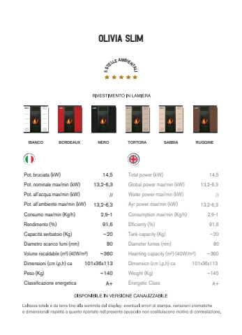 OLIVIA SLIMBIANCO BORDEAUX NERO TORTORA SABBIA RUGGINEPot. bruciata (kW) 14,513,2-6,3//13,2-6,32,9-191,6~20~360~14080101x36x113A+14,513,2-6,3//13,2-6,32,9-191,6~20~360~14080101x36x113A+Pot. nominale max/min (kW)Pot. all%u2019acqua max/min (kW)Pot. all%u2019ambiente max/min (kW)Consumo max/min (Kg/h)Rendimento (%)Capacit%u00e0 serbatoio (Kg)Diametro scarico fumi (mm)Volume riscaldabile (m%u00b3) (40W/m%u00b3)Dimensioni (cm l,p,h) caPeso (Kg)Classificazione energeticaTotal power (kW)Global power max/min (kW)Water power max/min (kW)Ayr power max/min (kW)Consumption max/min (Kg/h)Efficienty (%)Tank capacity (Kg)Diameter fumes (mm)Heanting capacity (m%u00b3) (40W/m%u00b3)Dimension (cm l,p,h) caWeight (Kg)Energetic Class5 STELLE AMBIENTALI