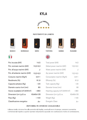 Pot. bruciata (kW) 14,513,2-6,3//13,2-6,32,9-191,6~20~360~1408062x60x125A+14,513,2-6,3//13,2-6,32,9-191,6~20~360~1408062x60x125A+Pot. nominale max/min (kW)Pot. all%u2019acqua max/min (kW)Pot. all%u2019ambiente max/min (kW)Consumo max/min (Kg/h)Rendimento (%)Capacit%u00e0 serbatoio (Kg)Diametro scarico fumi (mm)Volume riscaldabile (m%u00b3) (40W/m%u00b3)Dimensioni (cm l,p,h) caPeso (Kg)Classificazione energeticaTotal power (kW)Global power max/min (kW)Water power max/min (kW)Ayr power max/min (kW)Consumption max/min (Kg/h)Efficienty (%)Tank capacity (Kg)Diameter fumes (mm)Heanting capacity (m%u00b3) (40W/m%u00b3)Dimension (cm l,p,h) caWeight (Kg)Energetic ClassKYLABIANCO BORDEAUX NERO TORTORA SABBIA RUGGINE5 STELLE AMBIENTALI