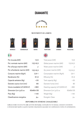 DIAMANTEBIANCO BORDEAUX NERO TORTORA SABBIA RUGGINE5 STELLE AMBIENTALIPot. bruciata (kW) 14,513,2-6,3//13,2-6,32,9-191,6~20~360~1408062x60x125A+14,513,2-6,3//13,2-6,32,9-191,6~20~360~1408062x60x125A+Pot. nominale max/min (kW)Pot. all%u2019acqua max/min (kW)Pot. all%u2019ambiente max/min (kW)Consumo max/min (Kg/h)Rendimento (%)Capacit%u00e0 serbatoio (Kg)Diametro scarico fumi (mm)Volume riscaldabile (m%u00b3) (40W/m%u00b3)Dimensioni (cm l,p,h) caPeso (Kg)Classificazione energeticaTotal power (kW)Global power max/min (kW)Water power max/min (kW)Ayr power max/min (kW)Consumption max/min (Kg/h)Efficienty (%)Tank capacity (Kg)Diameter fumes (mm)Heanting capacity (m%u00b3) (40W/m%u00b3)Dimension (cm l,p,h) caWeight (Kg)Energetic Class
