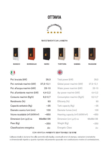 OTTAVIAPot. bruciata (kW) 29,327,3-12,123-104,4-2,26,2-2,793~35~650~25010066x68x136A+29,327,3-12,123-104,4-2,26,2-2,793~35~650~25010066x68x136A+Pot. nominale max/min (kW)Pot. all%u2019acqua max/min (kW)Pot. all%u2019ambiente max/min (kW)Consumo max/min (Kg/h)Rendimento (%)Capacit%u00e0 serbatoio (Kg)Diametro scarico fumi (mm)Volume riscaldabile (m%u00b3) (40W/m%u00b3)Dimensioni (cm l,p,h) caPeso (Kg)Classificazione energeticaTotal power (kW)Global power max/min (kW)Water power max/min (kW)Ayr power max/min (kW)Consumption max/min (Kg/h)Efficienty (%)Tank capacity (Kg)Diameter fumes (mm)Heanting capacity (m%u00b3) (40W/m%u00b3)Dimension (cm l,p,h) caWeight (Kg)Energetic ClassBIANCO BORDEAUX NERO TORTORA SABBIA RUGGINE5 STELLE AMBIENTALI