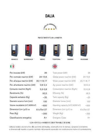 DALIAPot. bruciata (kW) 2624-10,620,11-8,173,9-2,45,3-2,892,5~25~600~20010061x70x127A+2624-10,620,11-8,173,9-2,45,3-2,892,5~25~600~20010061x70x127A+Pot. nominale max/min (kW)Pot. all%u2019acqua max/min (kW)Pot. all%u2019ambiente max/min (kW)Consumo max/min (Kg/h)Rendimento (%)Capacit%u00e0 serbatoio (Kg)Diametro scarico fumi (mm)Volume riscaldabile (m%u00b3) (40W/m%u00b3)Dimensioni (cm l,p,h) caPeso (Kg)Classificazione energeticaTotal power (kW)Global power max/min (kW)Water power max/min (kW)Ayr power max/min (kW)Consumption max/min (Kg/h)Efficienty (%)Tank capacity (Kg)Diameter fumes (mm)Heanting capacity (m%u00b3) (40W/m%u00b3)Dimension (cm l,p,h) caWeight (Kg)Energetic ClassBIANCO BORDEAUX NERO TORTORA SABBIA RUGGINE